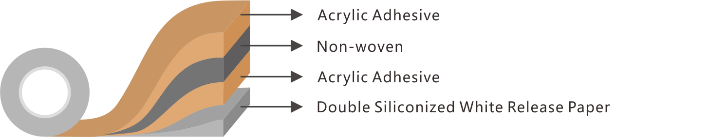 ? Double sided non-woven tape using soft non-woven as carrier and coated with high performance adhesive.